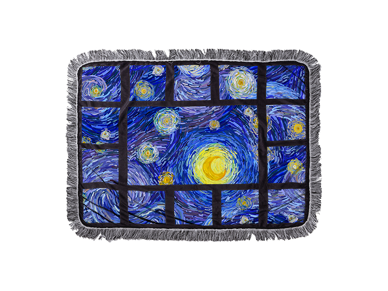 Material: Plush Material with Tassels, One side with 15 white panels ready for sublimation printing. the other side in black plush. White panel are Printable